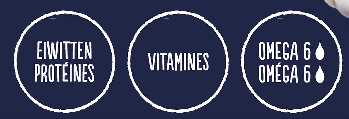 Granen, Vlees en dierlijke bijproducten, Oliën en vetten, Plantaardige eiwitextracten, Mineralen, Suiker, Gist, Vis en visbijproducten (1%*).