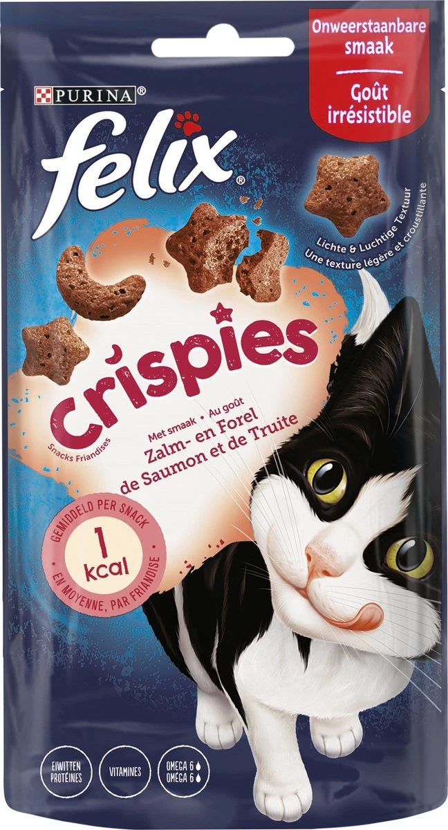 Verwen je kat vaker en deel nog meer ondeugende momenten samen! Felix® Crispies Snacks zijn onweerstaanbaar luchtig en hebben een unieke lichte en knapperige textuur om je kat elke dag te verwennen. Met Zalm- en Forelsmaak.
