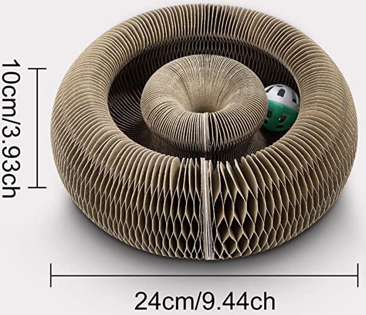Dit kattenspeelgoed is gemaakt van vervormnaar golfkarton. Aan de uiteinden zitten magneten, waarmee je de uiteinden aan elkaar klikt. Het is dus ook mogelijk om meerdere aan elkaar te klikken! Er zit een balletje bij met belletjes erin. Het balletje blijft er steeds in, ookal vervormt het speelgoed doordat poes erop springt of erin wil duiken.