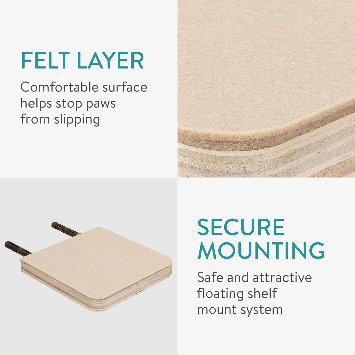 - BEKLEED MET VILT: Voor extra veiligheid zijn de plankjes voorzien van een laag vilt. Dit beschermt de klauwen van je katten en zorgt ervoor dat ze niet uitglijden op het hout.
