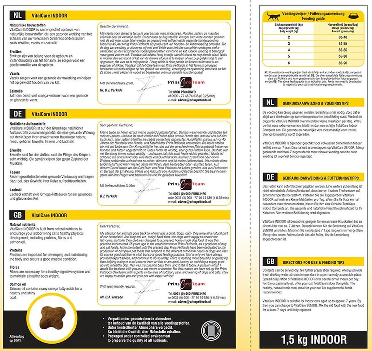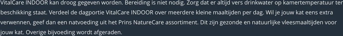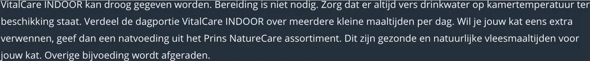 VitalCare INDOOR is een hoogwaardige voeding speciaal voor katten die in huis leven. Binnenkatten zijn vaak wat minder actief en hebben daarom een lagere voedingsbehoefte. Het hoge eiwitgehalte zorgt dat de spieren intact blijven en het lagere vetgehalte helpt je kat op gewicht te blijven. Hierdoor is de VitalCare INDOOR ook bijzonder geschikt voor gesteriliseerde of gecastreerde katten. Door toevoeging van natuurlijke vezels vormen haren die worden ingeslikt tijdens het wassen geen haarballen in de maag. De vezels zorgen voor een natuurlijke afvoer via het maag-darmkanaal van de kat. Hierdoor verlaten de haren het lichaam met de ontlasting en geven ze geen problemen meer. Veel binnenkatten hebben last van gebitsproblemen. De vorm van het brokje is zo ontworpen dat de kat beter moet kauwen. Dit helpt tandsteen en tandplak voorkomen. Urineverzurende stoffen helpen blaasgruis te voorkomen.