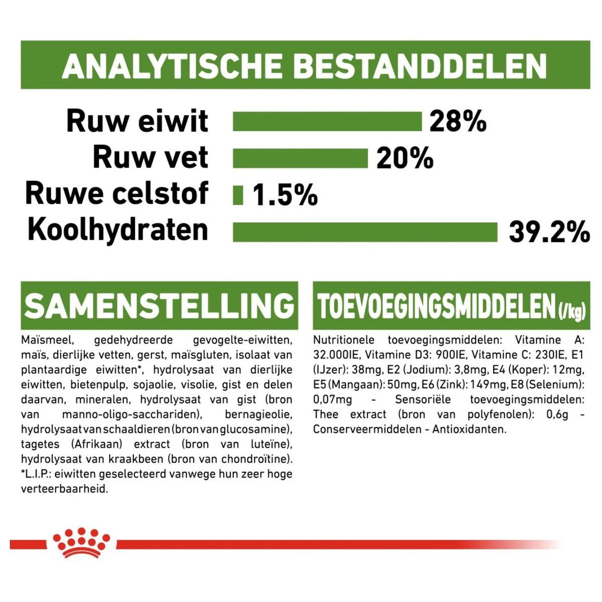 | Toevoegingsmiddelen | Gedehydreerd gevogeltevlees, maïs, maïsmeel, gerst, tarwe, maïsgluten, dierlijke vetten, isolaat van plantaardige eiwitten*, hydrolysaat van dierlijke eiwitten, plantaardige vezels, bietenpulp, mineralen, sojaolie, visolie, eipoeder, hydrolysaat van gist (bron van Manno-Oligo-Sacchariden), bernagieolie, extracten uit groene thee en druiven (bron van polyfenolen), hydrolysaat van schaaldieren (bron van glucosamine), Tagetes (Afrikaan) extract (rijk aan luteïne), hydrolysaat van kraakbeen |