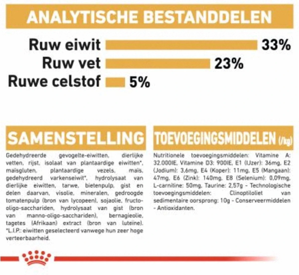 | Voedingswaarde | Samensteling: gedehydreerde gevogelte-eiwitten, dierlijke vetten, rijst, isolaat van plantaardige eiwitten*, maïs, plantaardige vezels, gedehydreerd varkenseiwit*, hydrolysaat van dierlijke eiwitten, tarwe, maïsgluten, bietenpulp, mineralen, gist, visolie, tomaat (bron van lycopeen), sojaolie, Fructo-Oligo-Sacchariden, hydrolysaat van gist (bron van Manno-Oligo-Sacchariden), bernagieolie, tagetes (Afrikaan) extract (bron van luteïne) |